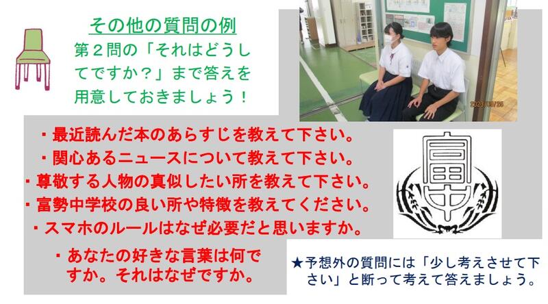 〇生徒には夏季休業中に質問用紙を記入してもらっていますので、それを中心に受け答えの練習をしていきます。例えば「将来の夢は何ですか?」「自分の長所・短所は何だと思いますか?」「普段の生活で気を付けていることは何ですか?」等の質問をします。それに対して生徒が答えた内容を受けて、「それはどうしてですか?」「そのことについてもう少し詳しく教えてください」と質問を続けます。