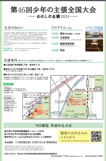 〇今年の第46回少年の主張全国大会「わたしの主張」は、11月に行われるようです。場所は国立オリンピック記念青少年総合センターで、入場は無料ですが事前申し込みが必要です。私も初めてその大会に行き、生で中学生の主張を聞いてみようかなと考えています。