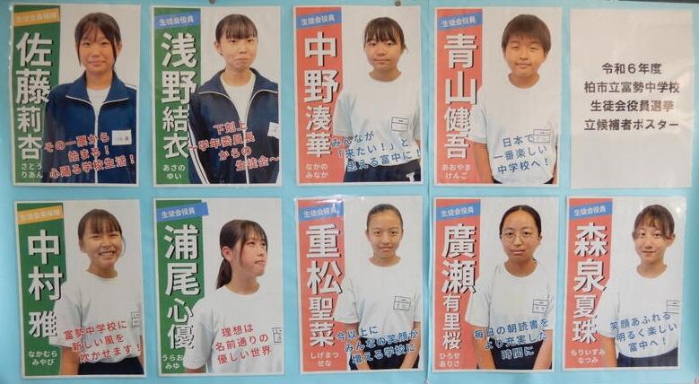〇特に今年は、本物の選挙ポスターのように、質の高い情報が各学年の生徒昇降口に掲示されています。選挙管理委員会の生徒たちは、自分たちのリーダーを決める大切なプロセスを管理しています。