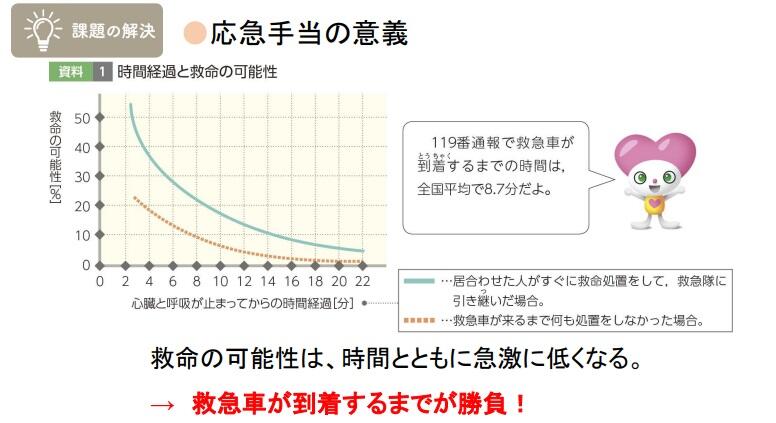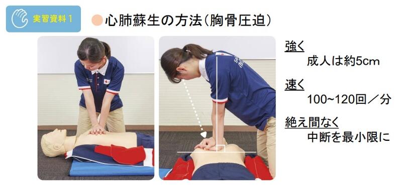 〇突然、心臓や呼吸が止まった人の命が助かる可能性は、10分間を過ぎると急激に少なくなるといわれています。心肺蘇生法とは、この止まってしまった心臓や呼吸の動きを助ける方法です。また、突然心臓が止まるのは、心臓がブルブルとけいれんする「心室細動」が原因となることが多く、この場合には出来るだけ早くAEDによる電気ショックをあたえ、心臓の動きを回復させることが有効です。