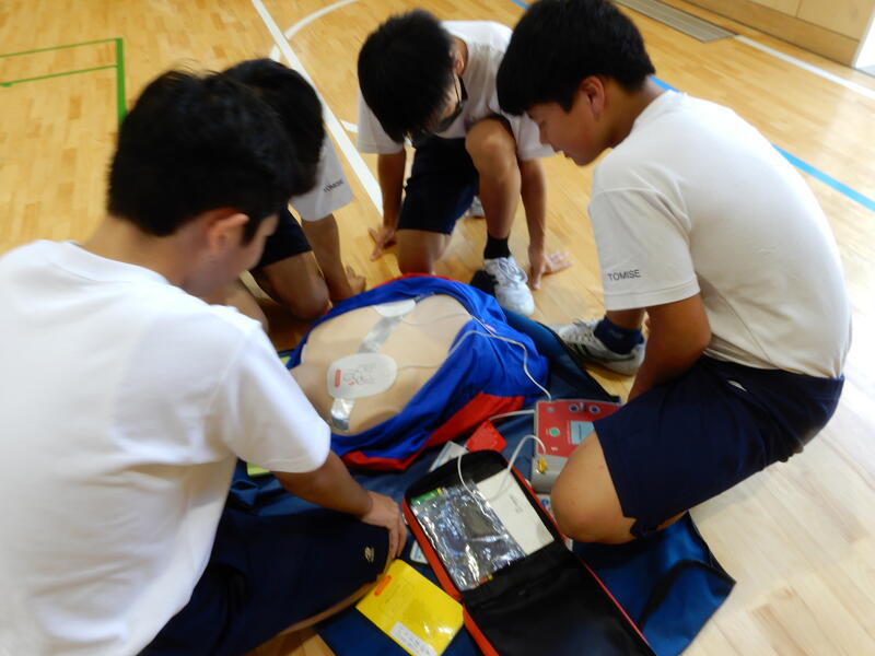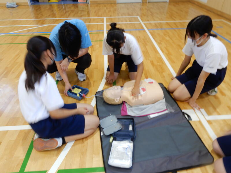 〇保健体育の授業では、「応急手当の意義と実際」の実習として、心肺蘇生法やAED(自動体外式除細動器)を使った救急救命法を行っています。生徒が学ぶのに合わせ、教職員も一緒に参加し、万が一の場合に備えるようにしています。
