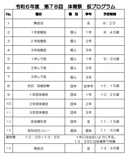 〇仮プログラムが出来ていますが、状況によっては変更する場合もありますので、正式なプログラムは来週に配付します。給食後に閉会式を行う予定です。