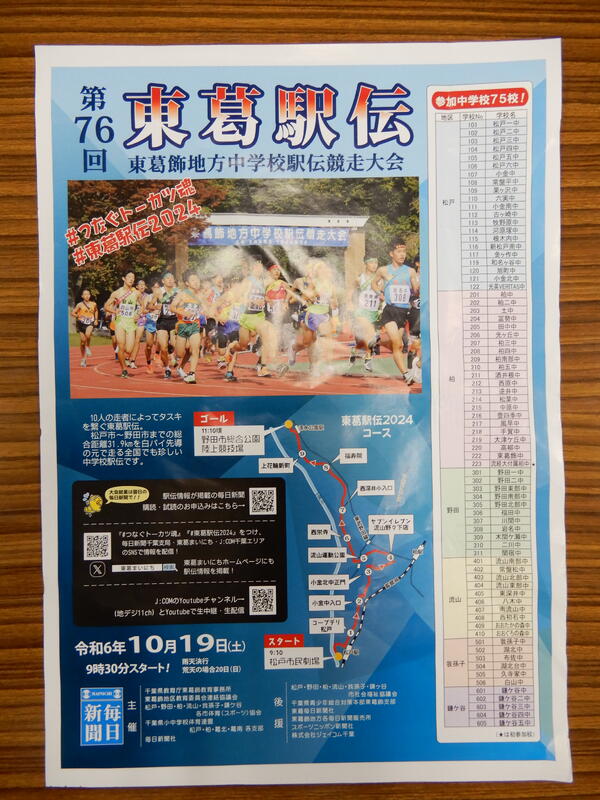 〇東葛飾6市(柏市 松戸市 流山市 野田市 鎌ヶ谷市 我孫子市)から73校が参加します。箱根駅伝でさえ20校ですから、その3倍以上の出場校数です。