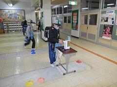 そのスペースを使って,検温・消毒器を2箇所に置き,昇降口の中に入ってから