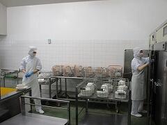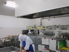 冷房のない中で、季節に関係なく肌を覆った服装での給食づくりです。