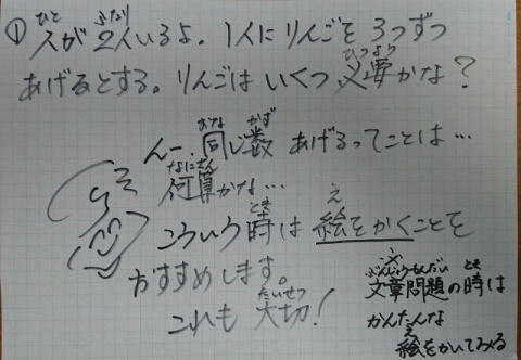 ※のところに書いたように、文章問題を場面の絵にかいてみることは大変有効です。文章から場面を読み取れない子どもはたくさんいます。最初はなかなか式にたどり着く絵がかけないばあいもあります。それでも、習うより慣れよで、続けているうちにつかめるようになるものです。文章問題が苦手という場合はぜひ声をかけてみてください。「絵をかいてごらんって校長先生が言ってるよ」と。