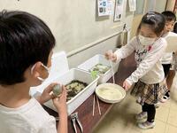 いよいよ給食の時間です。当番の子ども達がおかずなどをよそい、