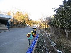 自分の植木鉢に水をやる1年生、ふせ菜の手入れをして霜柱を踏みしめる5年生。朝の風景。