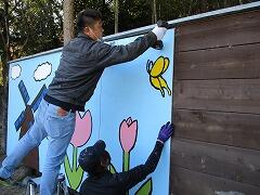 いよいよ、取り付けです。6年生が下絵を描き、全校児童が着色した8枚の板が1枚1枚取り付けられていきます。