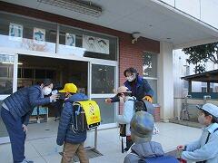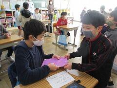 受け取った6年生もうれしそう、そしてちょっぴりはずかしそう。マスクでお互いの口元は見えませんが、どちらも笑顔です。