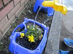 鉢植えではパンジーが咲いています。その土の中にはチューリップの球根がじっと春を待っています。