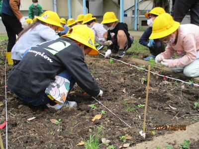 あけぼの山農業公園の橋本先生と元山先生を講師に迎えて、ひまわりの種をまきました。詳しく説明を聞いた後,まき方のポイントを思い出しながら種をまきました。子ども達から「大きく育つといいな」と言う声が聞かれました。これから,ぐんぐん育つように世話をしていきたいと思います。