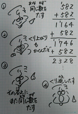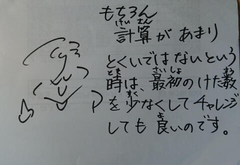 この計算は岸本裕史先生という昭和の代表的な小学校教師が著書で紹介したものです。目指す答えがわかった上で計算を続けるという普通の計算とは違う側面を持っています。9回目の足し算で10倍になれば正解、ならなければ不正解。終わった時点で、○×がはっきりします。ここが優れているところです。ただ、×だったとき、そのままにしては学びはありません。「くやしい、○になりたい」という思いはどの子にもあるのですが、その表現の仕方は子によって違います。○になるまでがんばってほしいのが、こちらの思いですが、「こんなの2度とやりたくない」となってしまってはあまりにも残念です。もし、側で見られるようでしたら、お子さんの様子に合わせて励ましの声をかけてあげてくださると幸いです。