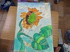 たて約54㎝×よこ約40㎝の4つ切り画用紙いっぱいにヒマワリの花が描けていて、