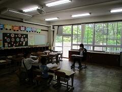 教室は、2年生の17名が最多です。どのクラスも、机の間隔を広げてあります。昨年度と同じように、教室の後ろから写真を撮っても全員が写真に収まらないことから広がっていることがわかります。