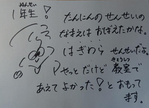 昨日に引き続き、感覚を十分にとって、2~6年生は体育館で、1年生は教室で行いました。担任は失礼ながらマスクを外しました。せっかくのご対面、顔が見えないと、という理由です。