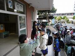 朝は、検温と手指消毒をして昇降口に入ります。「おはようございます」と