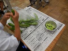 1年生は,1校時に本日の給食に出るそら豆のさやむきをしました。