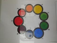 赤・青・黄の3色だけを使って,9色の色を作りました。