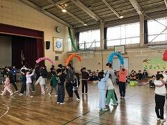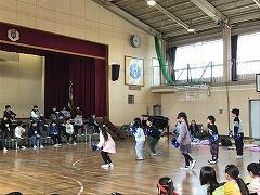<5年生の発表>林間学校で盛り上がった「マイムマイム」「ジェンカ」を一緒にやって,盛り上がりました
