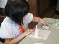 富勢西小学校では,各学年の発達段階に応じて,地域の方々とのふれあい活動を実施しています。地域社会の一員であるという自覚をもたせ,思いやりや地域を愛する心情を育てていくこと,地域の方とコミュニケーションを図ることがねらいです。今年度最初の活動として2年生が地域の皆さんと交流を図りました。折り紙を使って思い思いに七夕飾りを作り,たくさんの願いを短冊に書き記しました。