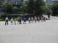 今年度最後の授業研究会が行われました。3年生の算数「円と球」の単元です。今日の授業は「円と球」の導入の時間です。ゲームを通じて「円」という用語を教え,円の定義につなげていくことがねらいです。子どもたちは体を動かしながら互いに考えを深めることができました。