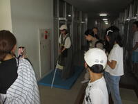 〇視覚障がい体験 :アイマスクをつけて白杖を持ち,目が見えない状態で歩く体験