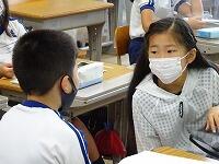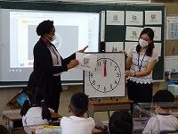 時刻の言い方を何度も聞いたり,ペアで質問したり答えたりして,外国語に慣れ親しんでいます。(写真は4年生)