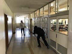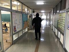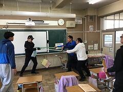 校内に不審人物が侵入して,児童に危険が迫る…という想定の対応訓練を2校時に実施しました。木の棒を持って校内を徘徊する不審者からの危険行為を回避するために,素早く教室の戸を施錠して,教室の端へ避難しました