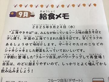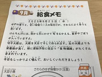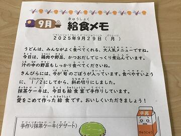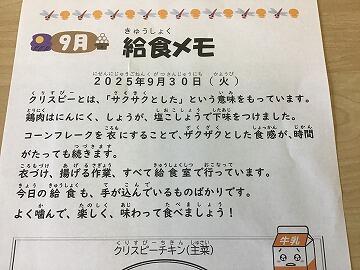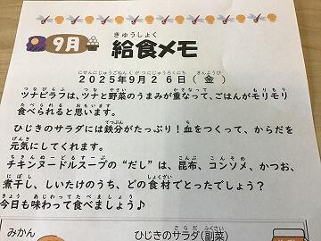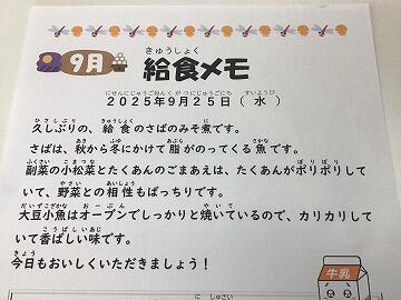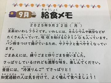 (3日目になってようやく気付きましたが,給食メモが「9月」のままになっていましたね来週からは「10月」になると思います