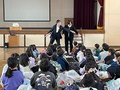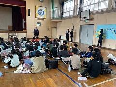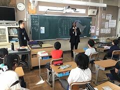 3校時に,1年生を対象とした防犯教室を行いました。柏警察署・生活安全課の皆さんを講師にお招きして,不審者と遭遇した時にどのように対処したらよいか,防犯ブザーの鳴らし方や「たすけてー!」と,道行く人に助けを求める方法について,実際にロールプレイング形式で教わりました。