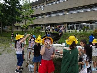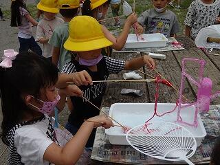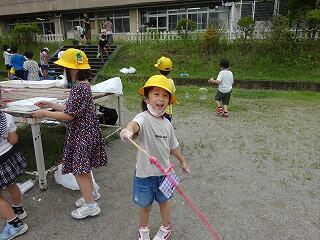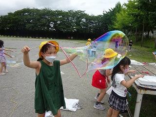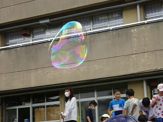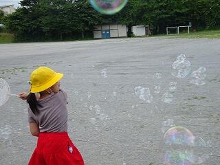 生活科の学習として「シャボン玉遊び」を行いました。ストローや毛糸,針金ハンガー,うちわ等を使ってシャボン玉を作りました。大きなシャボン玉やたくさんのシャボン玉を作るためにはどうしたらよいのか?それぞれが考えながら工夫して楽しく遊びました。