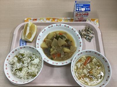グリンピースごはん・豚肉と大根の煮物・かきたま汁・美生柑・大豆小魚・牛乳
