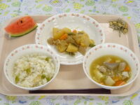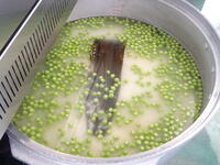 むいたグリンピースは,コンブでだしをとった白米と一緒に炊き,グリンピースご飯になりました。子どもたちは,自分がむいたことで食への感謝をさらに感じとったようで,残さず食べる姿がありました。