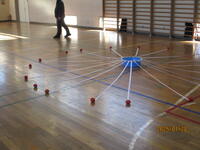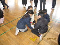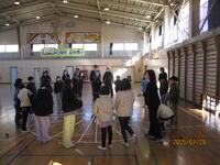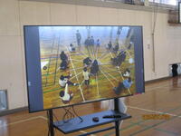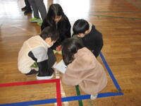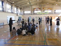 今年度最後の授業研究会が行われました。3年生の算数「円と球」の単元です。今日の授業は「円と球」の導入の時間です。ゲームを通じて「円」という用語を教え,円の定義につなげていくことがねらいです。子どもたちは体を動かしながら互いに考えを深めることができました。
