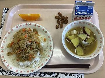 豚丼・さつま汁・炒りアーモンド・オレンジ・牛乳