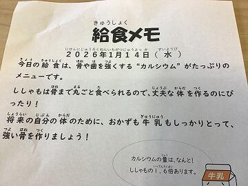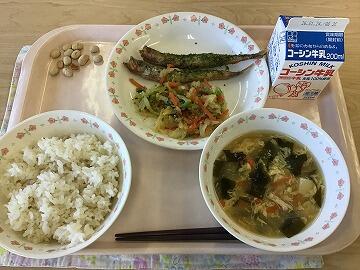 ししゃもの磯辺揚げ・ちんげん菜のごまあえ・かきたまみそ汁・ごはん・炒り大豆・牛乳
