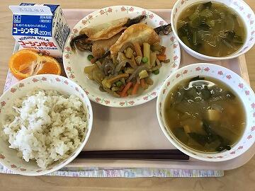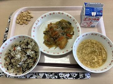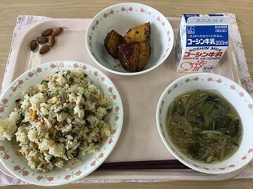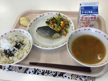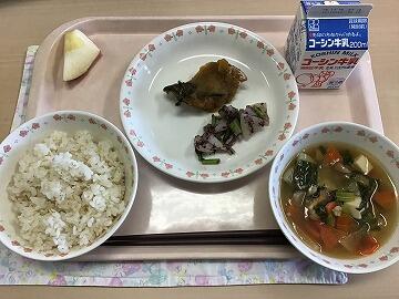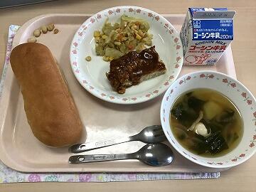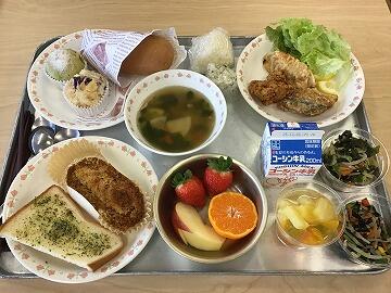 白米・わかめごはん・ガーリックトースト・ミルクパン⇒2つ選択 鶏の唐揚げ・揚げ餃子・鮭のチーズパン粉焼き・鯖の竜田揚げ⇒2つ選択 海藻サラダ・のりあえ⇒1つ選択 マカロニと野菜のスープ⇒全員 抹茶ケーキ・ブルベリジャムケーキ・サイダーポンチ⇒1~2つ選択 いちご(2個)・みかん(半分)・りんご(1/8)⇒2つ選択 牛乳⇒全員 |