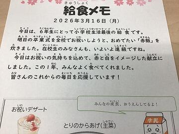 今日で1年間の給食も全て終了,栄養士さん・調理員さんの皆様,美味しい給食を作ってくださり,本当にありがとうございました