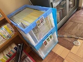 昨年度までに比べ,図書館を使った授業時間数は減ってしましましたが,資料をいつでも利用できるように準備しています。複数冊ある本にはナンバーリングし,ケースに入れてすぐに教室へ運べる状態です。