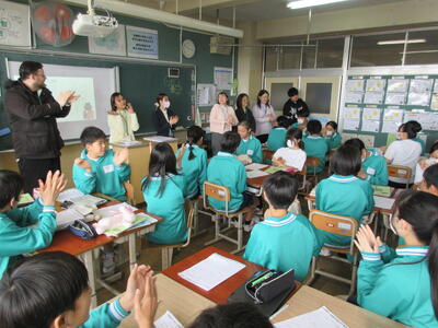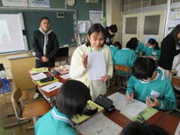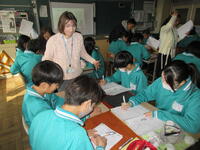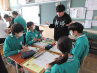 今日は、ALT(外国人英語教師)が9名も来校して、国際交流授業が行われました。授業では、少人数グループに分かれ、それぞれのグループに一人ずつ先生方がついて指導をしてくださいました。みんな一生懸命に英語を使って相手に質問したり、相手の言葉を聞き取ったりしながら、生き生きと学習に取り組んでいました。