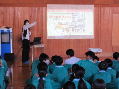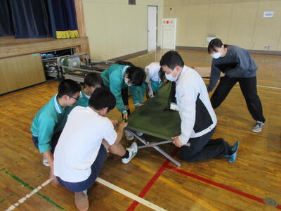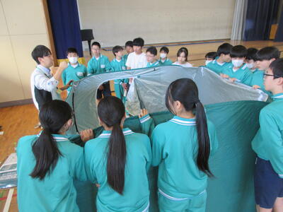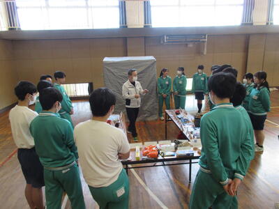 本日は、3年生を対象に防災安全教室が行われました。今後、有事の際には「地域に貢献できる人材になってほしい」という願いが込められた卒業前の授業でした。みんなでテントや簡易ベッドを組み立てたり、様々な防災グッズを実際に手に取ったりするなど、災害時に役立つ知識や備えの大切さを学ぶ貴重な時間となりました。