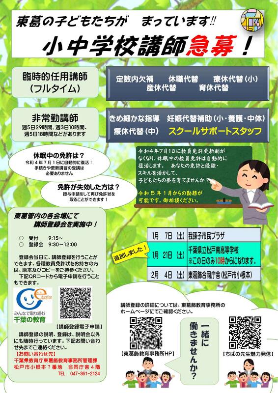 一覧へ 『スクール・サポート・スタッフ』募集のお知らせ 投稿日時: 2023/01/18 豊四季中学校管理者 この度、県教育委員会における「働き方改革推進月間の取組」において「スクール・サポート・スタッフ」の配置拡大が示されました。詳細につきましては、以下の内容をご確認ください。 ※手紙画像をクリックすることで、PDFをダウンロードできます。 <スクール・サポート・スタッフについて> <講師登録会ポスター>