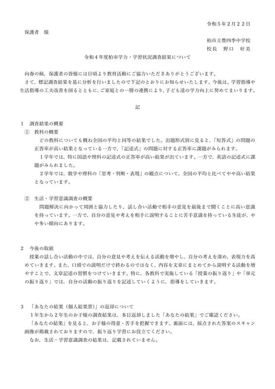 一覧へ 令和4年度柏市学力・学習状況調査結果について 投稿日時: 2023/02/22 豊四季中学校管理者 本日、生徒に個人票を配布いたしました。 こちらの手紙に、本校の結果を分析し、今後の取組についてまとめましたので、ご確認ください。