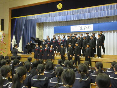 吹奏楽部の演奏、生徒会本部の皆さんによる活動説明、そして2・3年生による校歌合唱。