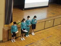 1年生の学年集会では、3学期の学習面や生活面を振り返りました。各クラスの代表がまとめ、わかりやすく発表しました。みんな真面目に話を聞いていました。4月からも、何事にも全力を尽くし、充実した学校生活にしましょう。
