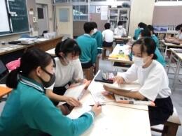 3年生の美術の授業では、「やきもの」をつくります。今日は、やきものについて知り、自分がつくるものをイメージして制作に必要な情報を収集しました。制作方法は、手びねり・ひもづくり・板づくり・型づくりの4種類です。各自で制作方法を選び、必要な情報をChrombookと本を使って調べてから、グループに分かれて調べた情報を共有しました。次回から、粘土を使って制作作業に入ります。作品完成が楽しみです。