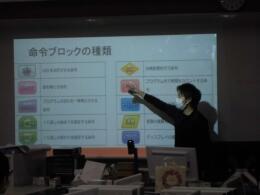3年生の技術科の授業では、プログラミングを学習しています。プログラミングの形式を使って命令ブロックと制御ブロックを操作し、LEDを点灯させる、メロディを鳴らす、ディスプレイを表示させることをプログラミングしていきます。生徒はみんな、先生の説明を熱心に聞いていました。