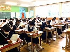 7月9日(木)と10日(金)の2日間、1学期の期末考査を行いました。9日は国語と英語と数学、10日は理科と社会と保健体育の合計6教科の試験をしました。本校の定期考査は制服を着用し、座席を出席番号順にして行います。今回は新型コロナウイルス感染防止対策として、他者との机や椅子の共用を避けるために、自分の机と椅子を出席番号順に移動して行いました。生徒は緊張感をもって、時間いっぱいまで取り組んでいました。