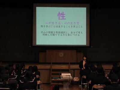 本日は、助産師の先生を講師にお招きし、3年生の皆さんに向けて性教育の授業が行われました。講話では、命の尊さや、これからの人生に役立つ様々なお話があり、皆、真剣な表情で耳を傾けていました。今日の学びを生かし、自分や周囲の人たちを大切にし、豊かな人生を歩んでいってほしいと願っています。